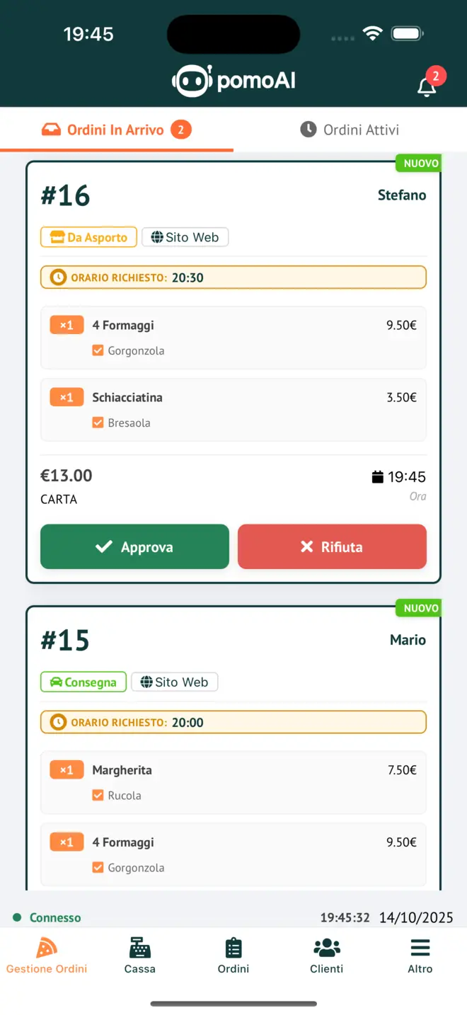 Dimentica carta e telefono: con pomoAI prendi ordini, gestisci clienti e controlli la tua pizzeria online in pochi click.