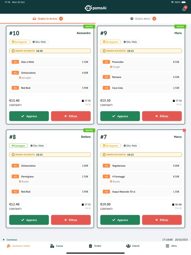 Con pomoAI gestisci menu digitale, sito per pizzeria, ordini online, consegne e cassa da un unico sistema in cloud.
